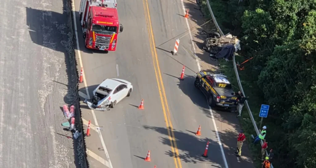 Segundo a Polícia Rodoviária Federal (PRF), a colisão ocorreu por volta das 13h, na altura do km 221 da rodovia, e envolveu três veículos: um Volvo XC60, com placas de Porto Alegre; um GM Cruze, com placas de Cianorte (PR); e um bitrem, emplacado em Ermo (SC).