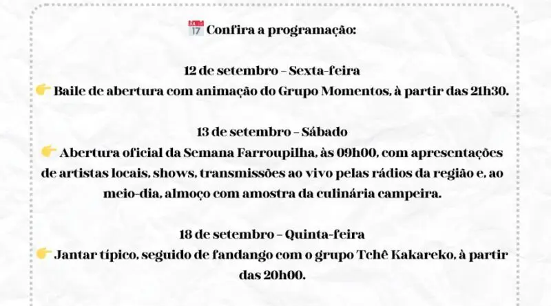 O CTG Nova Querência de Panambi definiu a programação da Semana Farroupilha 2025, considerada pelo patrão Marcos Ristow como um momento de união, cultura, música e da gastronomia típica