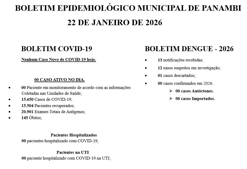 Em relação à Covid, não há nenhum registro de caso confirmado em Panambi neste início de 2026. Também não há nenhum paciente em monitoramento.