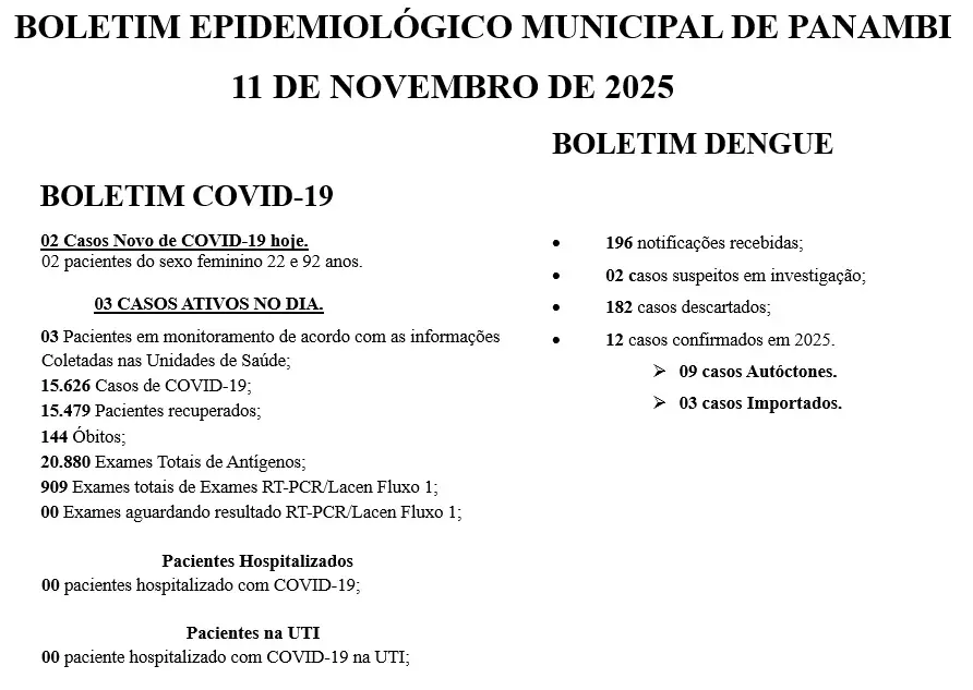 Secretaria Municipal da Saúde de Panambi divulgou no final da tarde da terça-feira novo Boletim Epidemiológico. De acordo com as informações, ontem foram registrados dois novos casos de Covid no município. São duas pacientes do sexo feminino, idades, 22 e 92 anos.