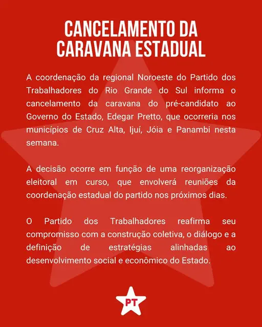 O cancelamento ocorreu após o Grupo Eleitoral criado pela direção nacional do PT decidir ontem que o partido se alie ao PDT e apoie Juliana Brizola como candidata a governadora. A determinação implode a candidatura de Edgar Pretto, aprovada em encontro nacional, apesar da resistência de parte das bases e líderes do PT e dos parceiros do PSOL O grupo de trabalho ainda dá a Edgar Pretto uma missão praticamente impossível, a de liderar a construção da aliança com o PDT.
