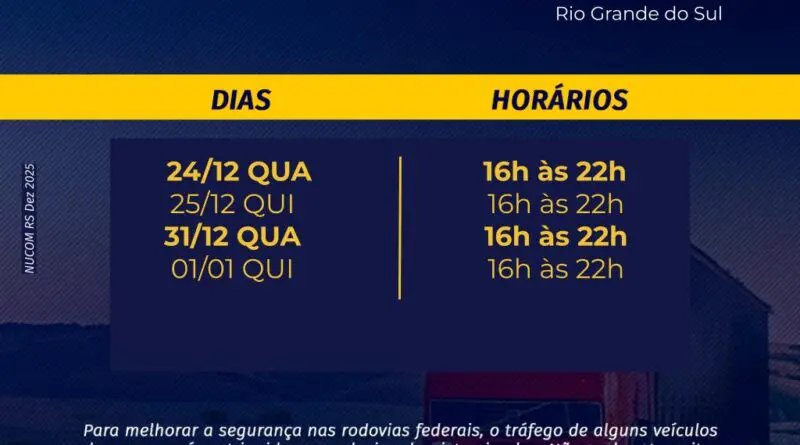 Nessa quarta e quinta-feira, das 16 às 22 horas, veículos longos não poderão circular em rodovias federais e estaduais de pista simples no Rio Grande do Sul. A medida visa evitar maior aumento de veículos, em razão do período de ano novo.