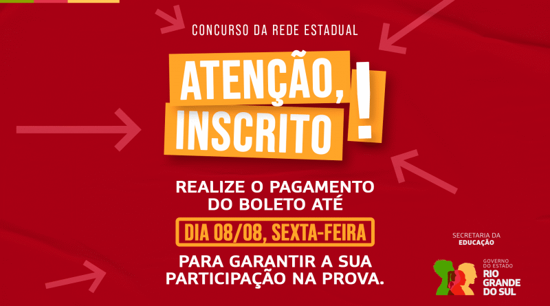 Os candidatos inscritos no concurso público para professores da Rede Estadual têm até esta sexta-feira dia 8 de agosto para realizar o pagamento do boleto de inscrição. A quitação dentro do prazo é indispensável para que a inscrição seja efetivada e homologada. O não pagamento exclui o candidato do processo seletivo.