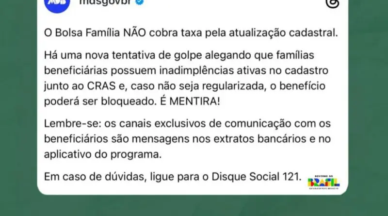 Informa que há  uma nova tentativa de golpe alegando que as famílias beneficiarias possuem inadimplências ativas no seu cadastro junto ao CRAS e caso não seja regularizada o benefício da família poderá ser bloqueado. É  Fake.