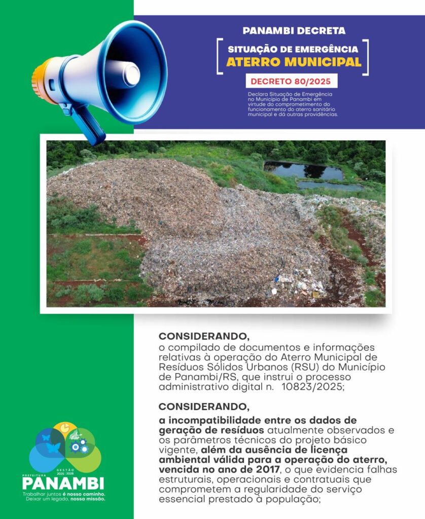 Segundo matéria da Assessoria de Imprensa da prefeitura repassada para os órgãos de Comunicação do município, “Nos primeiros seis meses de gestão, a atual Administração buscou incansavelmente soluções técnicas, jurídicas e operacionais para mitigar os graves problemas herdados”. “Foram inúmeras as tentativas de reverter um quadro que, infelizmente, já estava em situação insustentável. Com seriedade e responsabilidade, a gestão reconhece que não havia alternativa senão declarar a emergência, com o objetivo de, em definitivo, enfrentar a situação e conduzir Panambi a uma solução duradoura, responsável e comprometida com os princípios da sustentabilidade”.