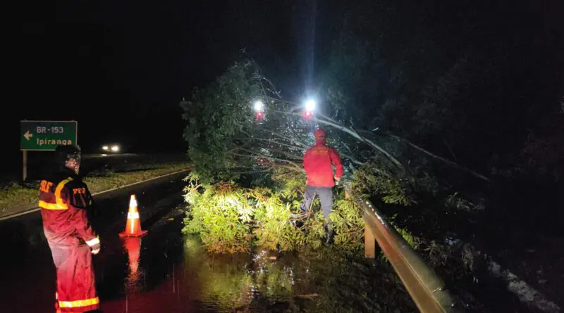 No final da tarde da quinta-feira (19), a Polícia Rodoviária Federal (PRF) atuou, juntamente com equipes do Corpo de Bombeiros Militar e da Defesa Civil, na desobstrução de mais de 30 pontos de interdição em rodovias federais causadas por queda de árvores após um forte temporal atingir a região norte do Rio Grande do Sul.