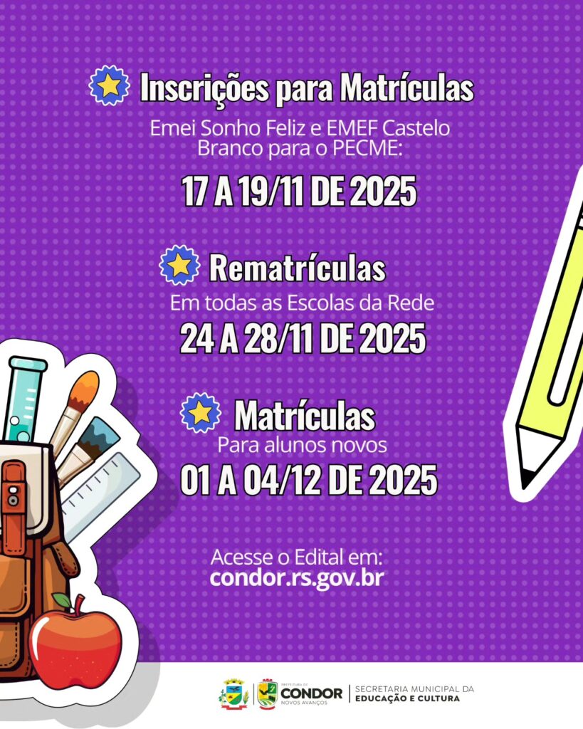 Secretaria Municipal de Educação de Condor está anunciando o calendário das matrículas e rematrículas para Educação Infantil, Ensino Fundamental e também transferências na rede municipal de ensino para o ano letivo de 2026.